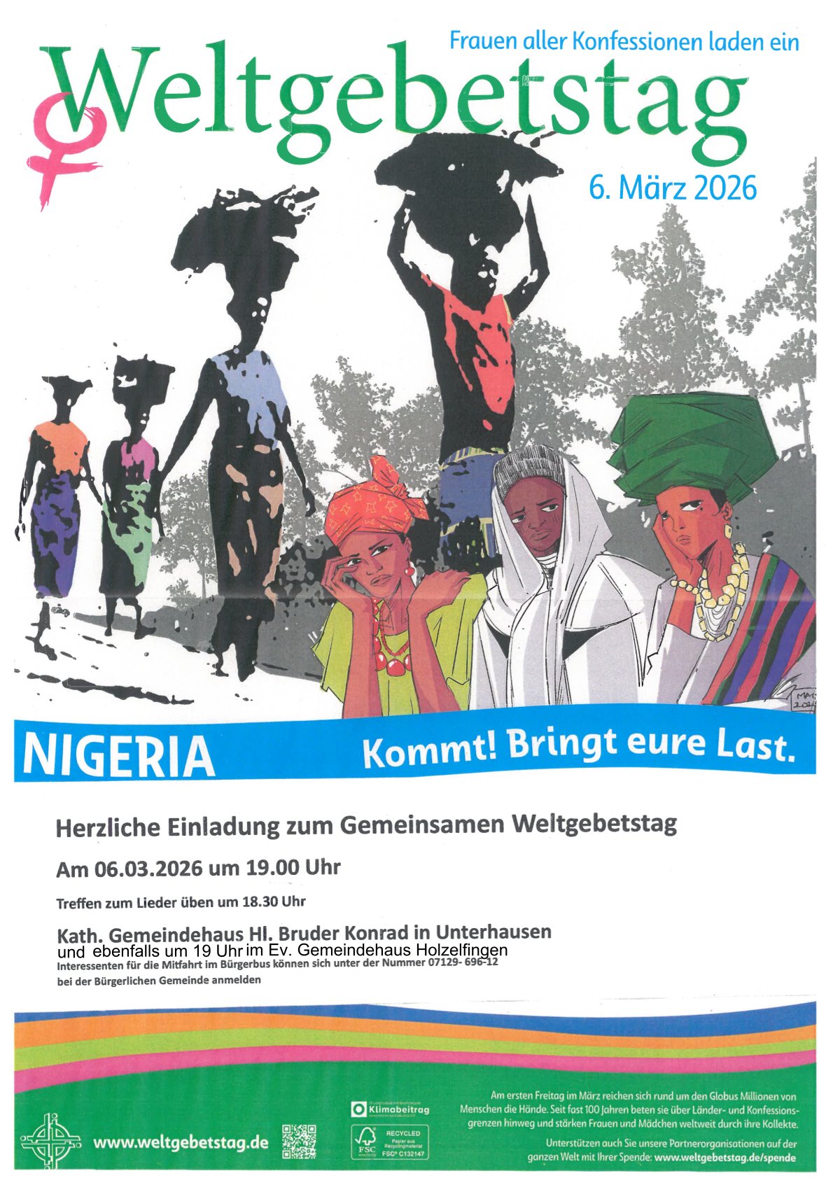 Am Freitag, den 6. März 2026, feiern Menschen in über 150 Ländern der Erde den Weltgebetstag der Frauen aus Nigeria. „Kommt! Bringt eure Last.“ lautet ihr hoffnungsverheißendes Motto. Wir feiern mit und treffen uns dazu im Katholischen Gemeindehaus Hl. Bruder Konrad in Unterhausen. Ab 18.30 Uhr können die Lieder eingeübt werden, um 19 Uhr beginnt der Gottesdienst. Wir hören die Stimmen aus Nigeria, lassen uns von ihrer Stärke inspirieren und bringen unsere eigenen Lasten vor Gott. Das ökumenische Vorbereitungsteam lädt ein zur Solidarität, zum Gebet und zur Hoffnung.